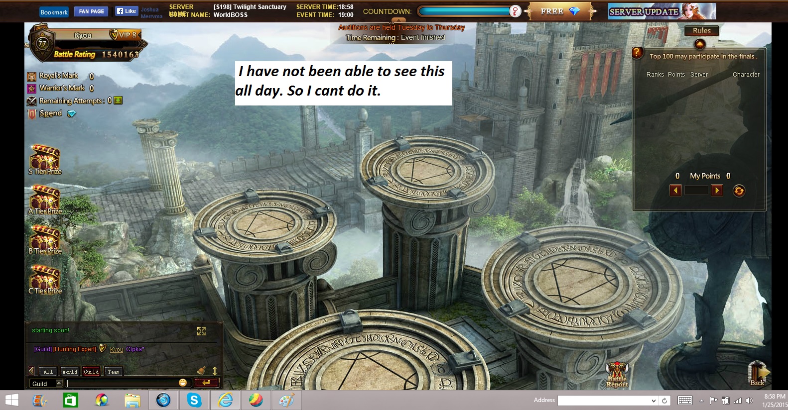 On Server 194 Myine Castle the Cross Server Tourney says tryouts Tues-Thurs and the event has ended. It loads the screen but there is nobody to fight. This is def a bug others on my server are experiencing the same thing. Is this gonna make us miss the Tourney?
