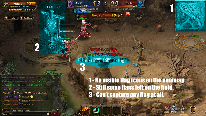 Details: Twilight Clash worked perfectly for the first two rounds. The 3rd one began normally but after a while things got worse. As you can see from the screenshot below, all the flag icons from the minimap disappeared (1), even though there were still some left on the field (2). Sadly, those flags could not be collected in any possible way (3). Furthermore, according to some of the players who were experiencing all this, even if it was still possible to attack other people, everybody stopped receiving kill points. We had to wait for the timer to run out in order to finish the match.