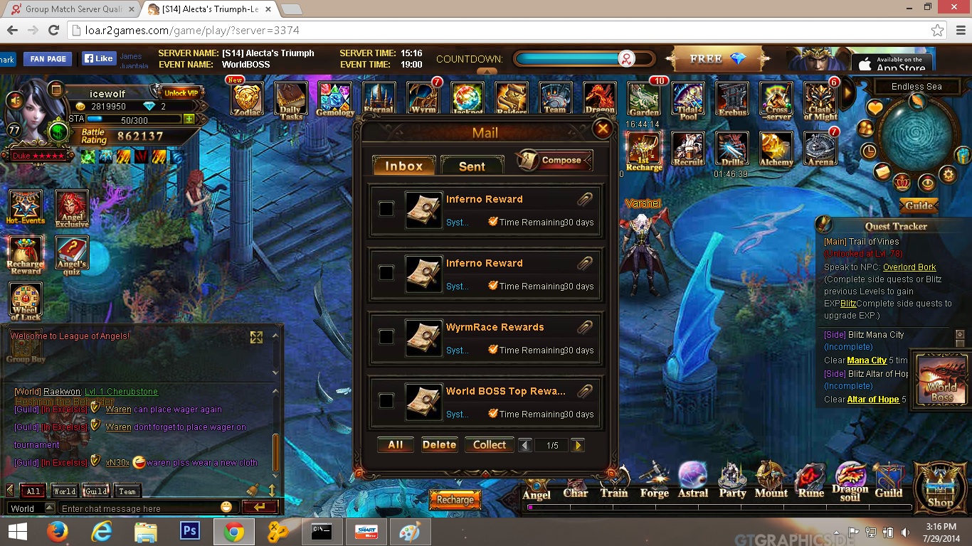 Details: Didn't receive mail with the chest server, i've checked all the mails. I've receive the "group round elim. chest" with those 150 WM and the Participation chest (the one with gold) but not the server one with the 60 WM. I've attached 3 photos (including TT picture that show i allready collected all of them and pictures with just the 2 mails i've received).