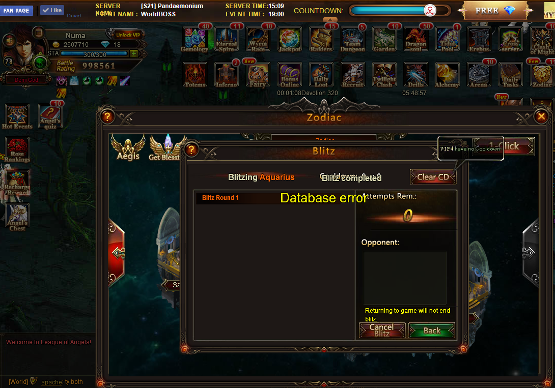 I have database error when blitzing in zodiac (1 click) and loop Q.. please fix it