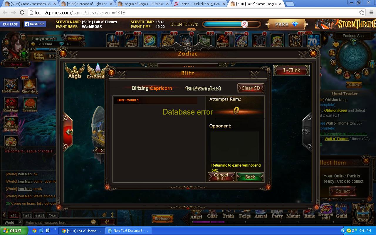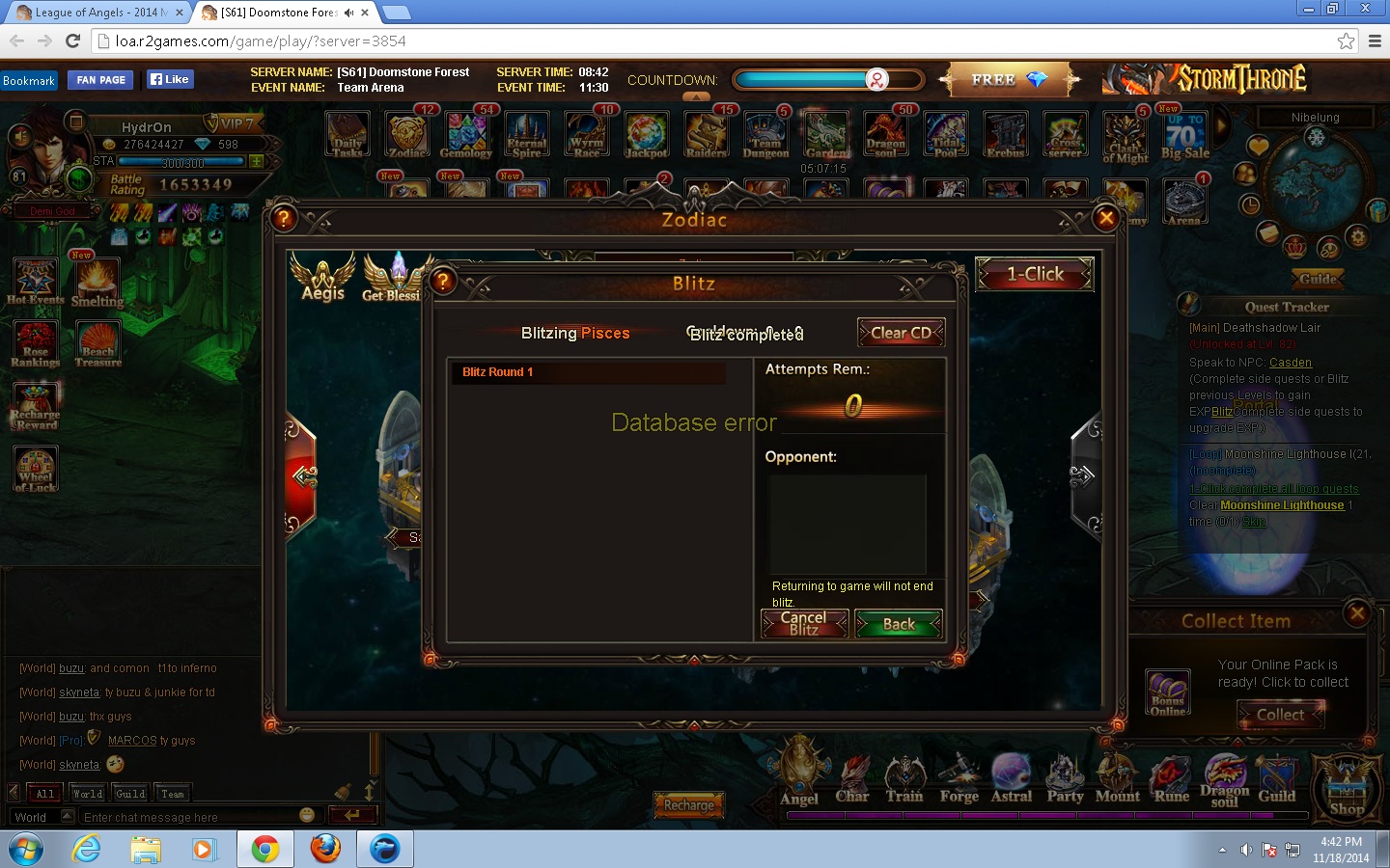 i have same issues like this i try to cancel blitz at zodiac but it doesnt work its says database error it started yesterday.. my vip status is useless when i cannot do blitzing it