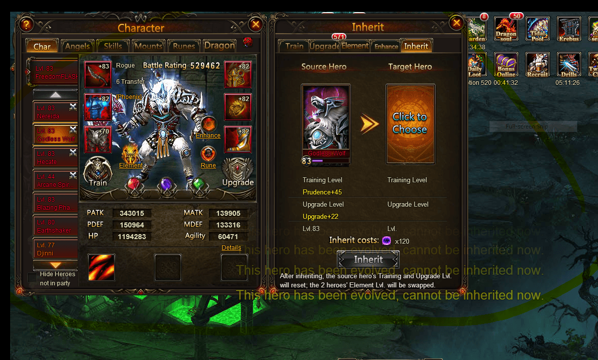 So like, the first time around I successfully inherited my GC to my ES to try and compare the different battle style of the 2, then I inherited the ES back to CLAW, since I still liked my CLAW better in certain areas. So now, my problem is it won't let me inherit my CLAW 2nd time around, and says "The hero has been evolved cannot be Inherited now", no seriously? Since when did evolved hero cannot be inherited was mentioned? This is pure BULL **** if it were to be implemented and forcing players to buy more resources to develop other heroes, monopolizing on resources now? What took me almost a year to collect, and I do not have the freedom to switch it around my desired heroes as I like? This needs to be fixed, cause this system will kill the versatile tactics approach in LOA.