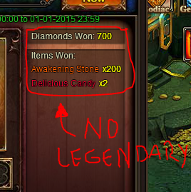 Without screen shot earlier, how do i know what you are getting at, All i see is the Screen shot below with 2k diamond and that is supposed to be LEGENDARY Rewards!Originally posted by ICSVortex10 View Postare you blind or what?? i say NOO LEGENDARY rewards! if you got a fuse gem that means you get LEGENDAY reward but ME only get a stupid candy when is supose to be a fuse gem or Dias!!!