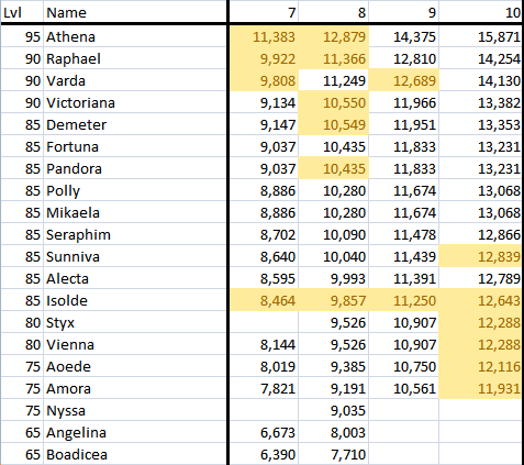 Raphael > Demeter > Pandora = Fortuna > Polly = Mikaela > Victoriana > Seraphim > Sunniva > Alecta
