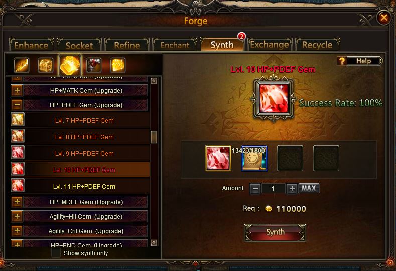 Another type of fuse gem she has is PATK+Crit which all lvl 10. It can also be bought from HoC and synth to lvl 10 too.