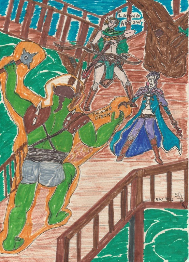 Seeing a Young elf nearly beheaded by 3 foul beasts, The half-elf bolts a dark Arrow hitting the Orc's row