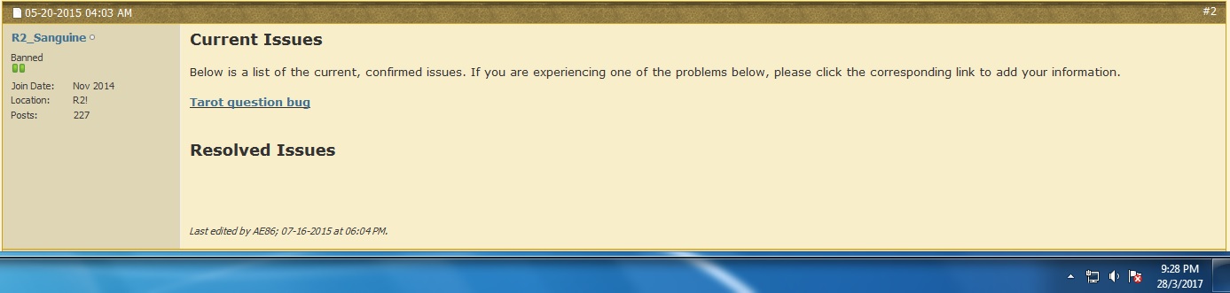 I'm pretty certain that other moderators will look to the 'recently' posted issues, and then report them to their higher ups. Just post in the forum, or- place a new topic with your bug.Originally posted by R210496643 View PostIs R2_Sanguine banned? If he/she is banned, how are the bugs in bug report mega-thread going to be reported and be solved? how can he/she post current, confirmed issues here? and how is he/she going to post resolved issues here?