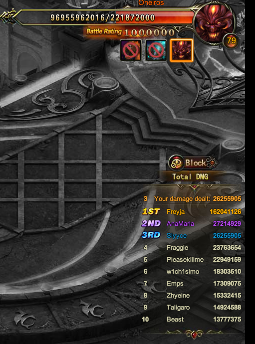 Need a massive HP boost and /or defense boost in the server....two to three hits for most and its one to two people per night taking 40% DMG from the rest to take advantage of. 221M is nowhere near enough for 1st boss...regardless of who's on the server everyone deserves a better chance to get something. Some of the people on the server get two hits maybe at most and I'm hearing people from other servers who get even less than that. Figure out a way to make it fair to everyone involved.