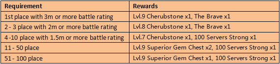 the battle rating rewards make me wish i was ranked between 11-50, instead of my current rank 3 with 2 mil + BR. i dont use a lvl8 cherub anymore. but lvl9 superior gems would be of great use for me.