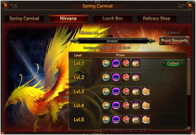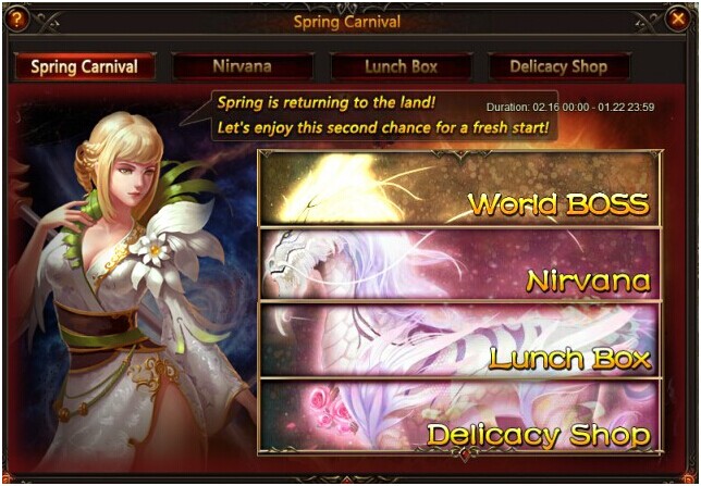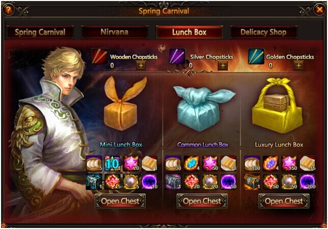 Click the icon of Spring Carnival, and you will see four parts. They are Spring Carnival, Nirvana, Lunch Box, and Delicacy Shop.