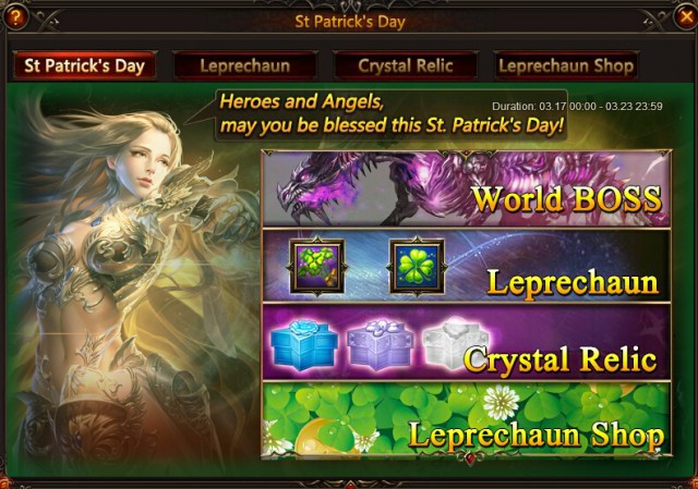 There are four parts to our St. Patrick's Day celebration: World Boss, Leprechaun, Crystal Relic, and Leprechaun Shop. Clovers and Clover Bouquets are tokens in this event, you can collect them from the World Boss, Hot Events or use Diamonds to purchase them.