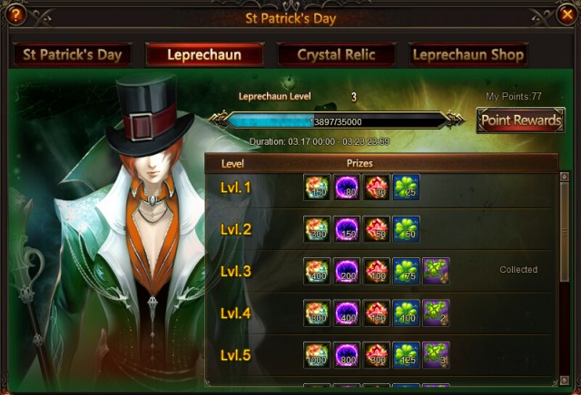 Every Clover acquired will earn you 1 personal point and increase Leprechaun EXP by 1. Every Clover Bouquet acquired will earn you 2 personal points and increase Leprechaun EXP by 2. All Leprechaun level rewards can be collected once daily when available.
