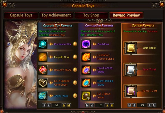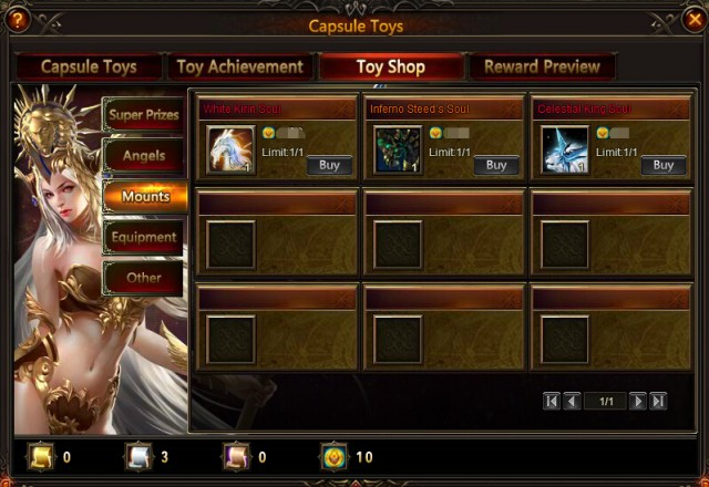 In the Toy Shop, you can get wonderful items, equipment, Angels, and Mounts by using Gold Tickets, Silver Tickets, Bronze Tickets, and Capsule Coins. This time you can compete for Snow Queen!