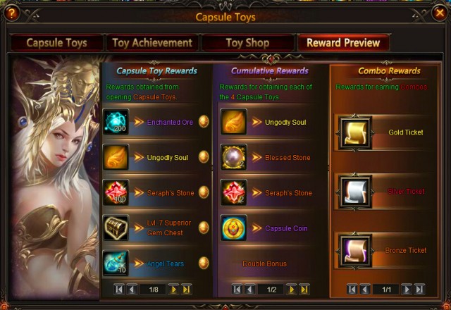 Awesome items await you in the Toy Shop! Use your hard earned Gold Tickets, Silver Tickets, Bronze Tickets, and Capsule Coins to get equipment, Angels, and Mounts! This time you can win an Armored Elephant!