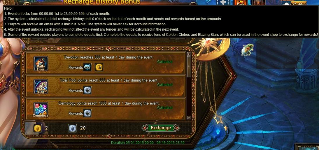 Recharge History Bonus is a monthly event in game. It offers a great bonus for your history recharge amount. Bonus are divided into several levels according to your history recharge amount.