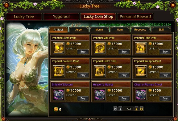 Lucky Coins, Diamonds and many other items hang upon the tree. You can get these items and earn points by blessing the Lucky Tree. Lucky Coins can be used in the Lucky Coin Shop to buy items. The points you accumulate will be added to the points for Yggdrasil, the World Tree, which shows total points for the whole server. Each time Yggdrasil upgrades, all players in the server can collect rewards and the items hanging on the Lucky Tree will be upgraded too!