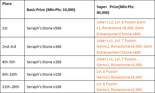 Total Ranking Rewards: At the end of the event, the top 20 players with at least 40,000 total points have a chance to win Joker (L)’s and Lvl. 8/7/6 Fusion Gem Chests