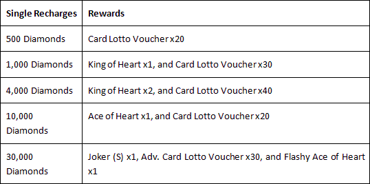 Description: Recharge certain amounts in one go to get extra rewards like King of Hearts, Ace of Hearts, Card Lotto Voucher, Hero's Mark, Flashy Ace of Hearts, and Joker (S).