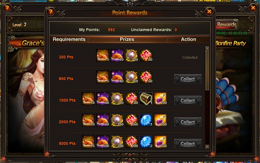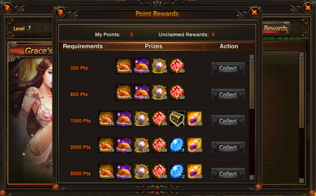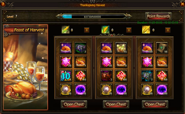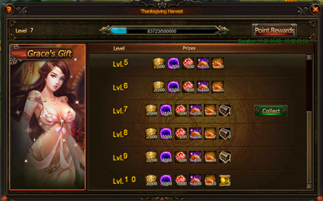 Fight together and get great rewards here! Click Grace's Gift to view the panel shown below. When Thanksgiving Harvest EXP reaches a certain amount, all players in the server can collect the rewards.