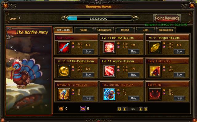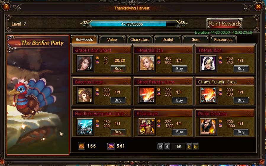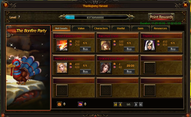 Some of the awesome items you can get from the Bonfire Party are: Little Red Fashion, Steampunk, Pirate Costume, Golden Attire, Summer Gear, Flaming Flower, Bat Wings; Powerful hero Chaos Paladin, Ghost Paladin and Headless Horseman, Valentina and Fallen Angel, Cedric, Dragon Queen, Dragon Empress; New Angel Grace, other awesome angels and Awakening Stones-- Isolde, Isolde Awakening Stone, Aphrodite, Aphrodite Awakening Stone, Themis, Hemera; Mount Jeweltone Turkey, Fiery Turkey, Persian Cat, Phoenix, Armored Rhino, Scarlet Finch, Polar Bear, Ruthless Leopard; Fairy Tutu, Golden Hamster, Little Bat, Silver Lord and so much more!
