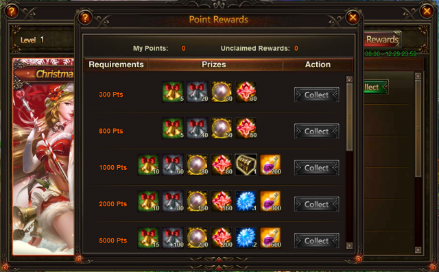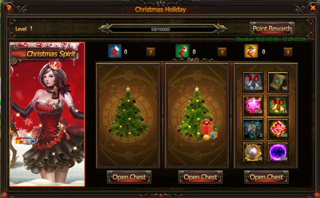 Fight together to earn great rewards here! Click on Christmas Spirit to see this panel. When Christmas Holiday EXP reaches a certain amount, all players in the server can collect rewards.