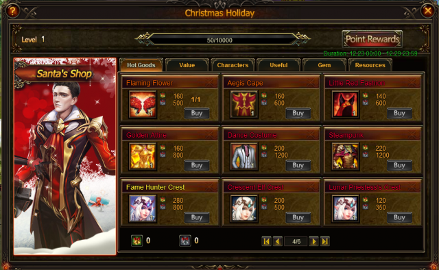 In Santa's Shop, Christmas Decorations for the Homestead will be on sale such as: Reindeer Statue Chest, Xmas Tree Chest; stunning clothing, wings--Popstar Fashion, Dance Costume, Steampunk, Little Red Fashion, Golden Attire, Summer Gear, Flaming Flower, Bat Wings; Powerful hero Lunar Priestess, Crescent Elf, Fame Hunter, Valentina and Fallen Angel, Cedric, Dragon Queen, Dragon Empress; New Angel Noelle, Grace, Claudia, Claudia Awakening Stone, other awesome angels-- Aphrodite, Themis, Hemera; New Sylph Ocarina; Mount Rudolph, Persian Cat, Phoenix, Armored Elephant, Tusky, Armored Rhino, Scarlet Finch, Polar Bear, Inferno Steed; Fairy Golden Hamster, Little Bat, Silver Lord and many more items!