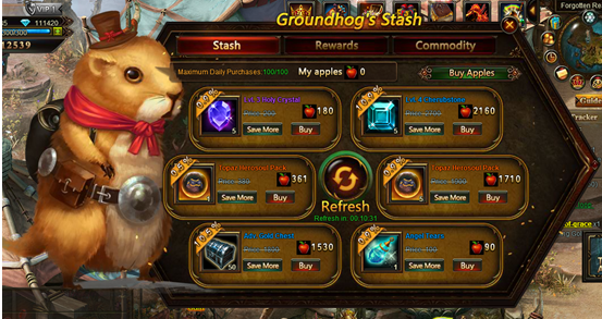 - Click the “Refresh†button for a chance to buy different discounted items. The commodities include Lvl. 4 to 6 Common Gem Chests, Lvl. 2 to 5 Superior Gem Chests, Garnet to Ruby Herosouls, Lvl. 1 to 4 Cherubstones, Synth Scrolls, Soulstones, Socketing Rods, Angel Tears, Aegis Shards, Fashion Cores, Timeskip Scrolls, and Gold.