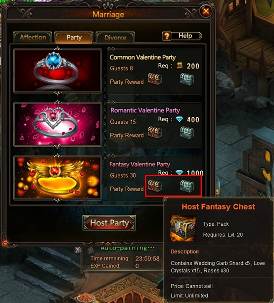 Click Marriage in the Character screen and navigate to the Party tab to host your own party. There are three types of parties to host; each one has a chance at winning Wedding Dress Shards.