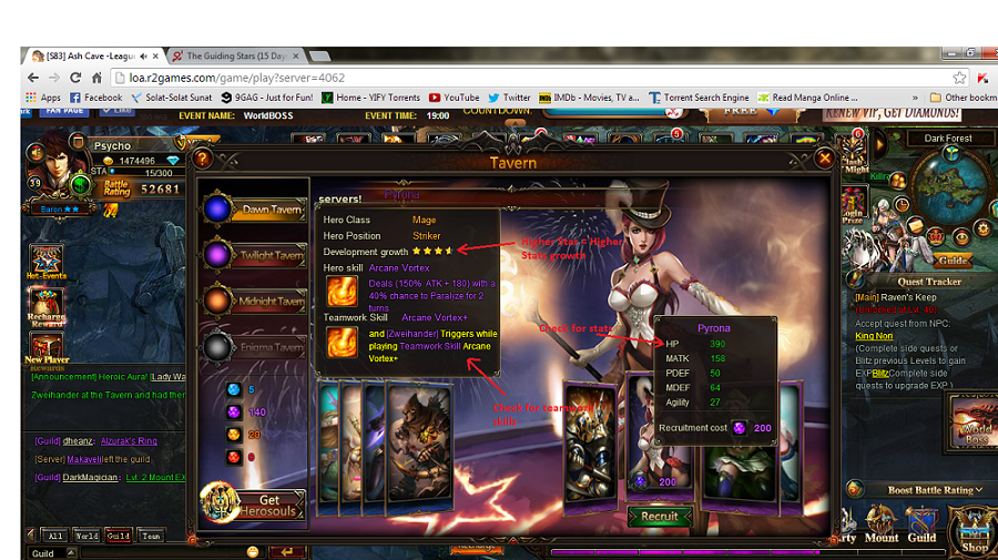 19. RECRUIT –(obtain at level 24) the more herosoul you have the better you recruit.. 2 free Recruits daily.