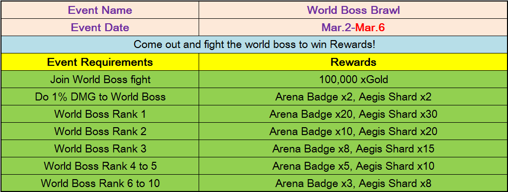 - Additional prize draws will be rewarded for ranking on the World Boss leader board.
