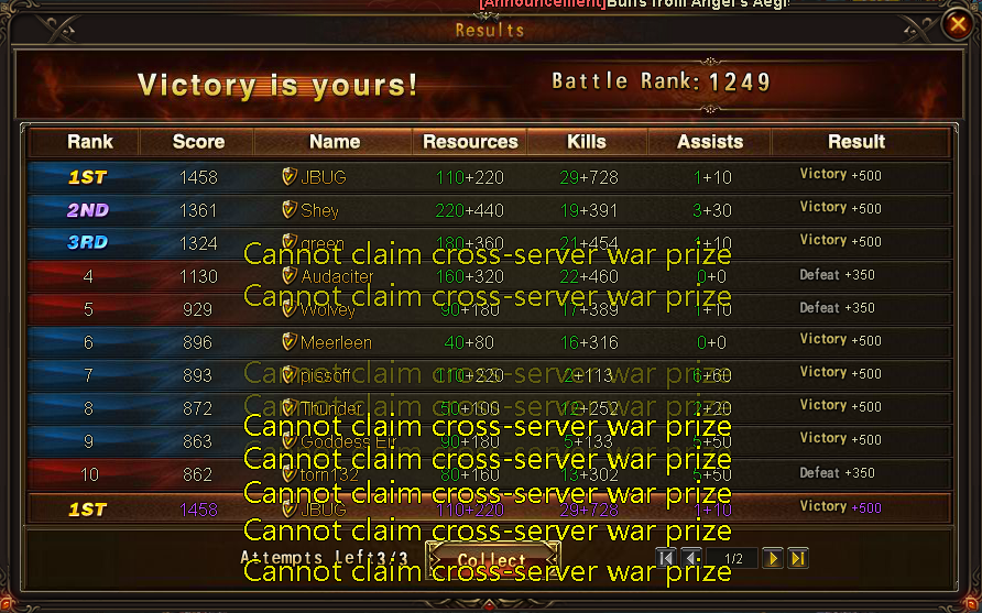 Now 3rd day in a row that CS is broken. No additional compensation awarded on day 2 or day 3 ... AND the compensation awarded was far less that what was stated at top of this post (only received 10K Honor). Plus, cannot spend more than 5K per day, my Emblems cannot be managed under the current conditions.
