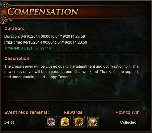 The cross-server will be closed due to the adjustment and optimization to it. The new cross-server will be released around this weekend. Later the compensation pack will be added to all servers. Thanks for the support and understanding, and Happy Easter!