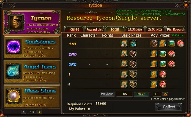 Description: Click on the Tycoon icon on the left-hand side of the game window to open up the Resource Tycoon panel. Players gain points by collecting the required resources during the event such as Gold, Runestones, Soulstones, Blessed Stones, Seraph's Stones, Element Crystal, Angel Tears, and Aegis Shards. Each day at 14:00 and 22:00 the point leaders will be determined and prizes will be set accordingly. Prizes include Aegis Shards, Synth Scrolls, Soulstones, and Blessed Stones with the grand prize being issued at the conclusion of the event.