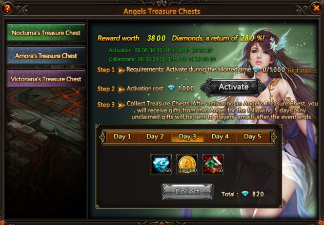 Description: Activate Victoriana’s Treasure Chest during the event to collect gifts from her for the next 5 days! Players can receive up to 16,000 Diamonds in return and rare treasures worth more than 40,000 Diamonds! Players must recharge the required amount of Diamonds during the event (June 6th-7th) to be able to use them to activate the Angel’s gifts!