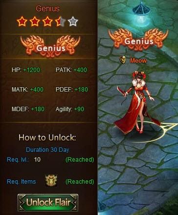 Bonuses: HP +1200,PATK +400, MATK +400, PDEF +180, MDEF +180, and Agility +90
