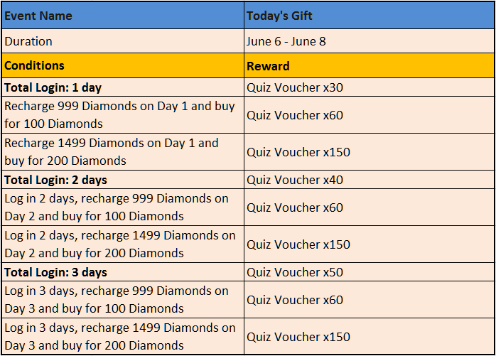 Description: Cumulatively recharge certain amounts of Diamonds during the event to get Magical Keys, Quiz Vouchers and many other rare items!