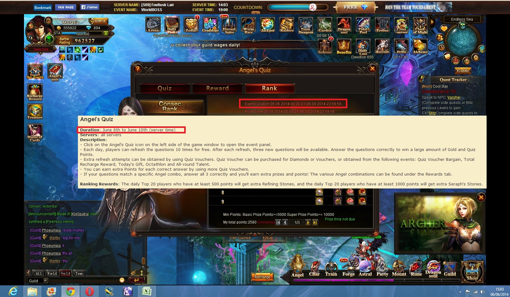 - Click on the Angel's Quiz icon on the left side of the game window to open the event panel.