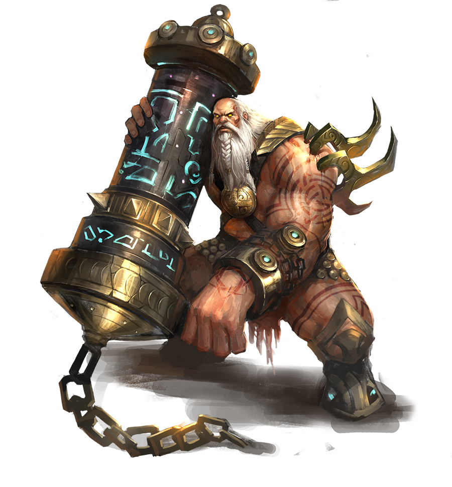 Earthshaker’s true name has long since been forgotten; however, it is easy to see where his nickname came from. His powerful physique and endurance are but two aspects he inherited from his Herculean lineage. A single step will cause those nearby to think a thunderstorm is approaching. He is the only one capable of maneuvering his deadly weapon, and no one survives his deadly strike.