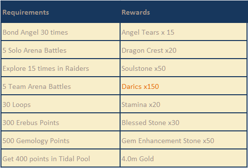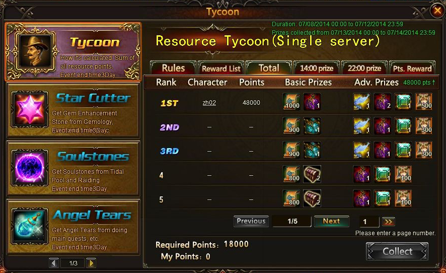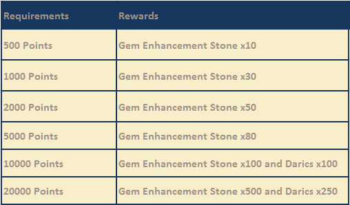 - Players gain points by collecting required resources during the event, i.e. Angel Tears, Runestones, Blessed Stones, Seraph's Stones, Aegis Shards, Soulstones, Refining Stones, Element Crystal, and Synth Scrolls.