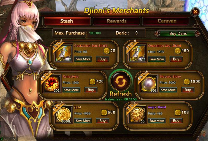 - Click the Refresh button for a chance to buy different discounted items. The commodities include Cockatrice Soul Shard, Lvl. 4 Cherubstone, Lvl. 4 Holy Crystal, Lvl. 5 Superior Gem Chest, Lvl. 5 Common Gem Chest, Blessed Stone, Seraph's Stone, Element Crystal, Refining Stone, Runestone, Soulstone, Aegis Shard, Angel Tears, Gold, and many more!
