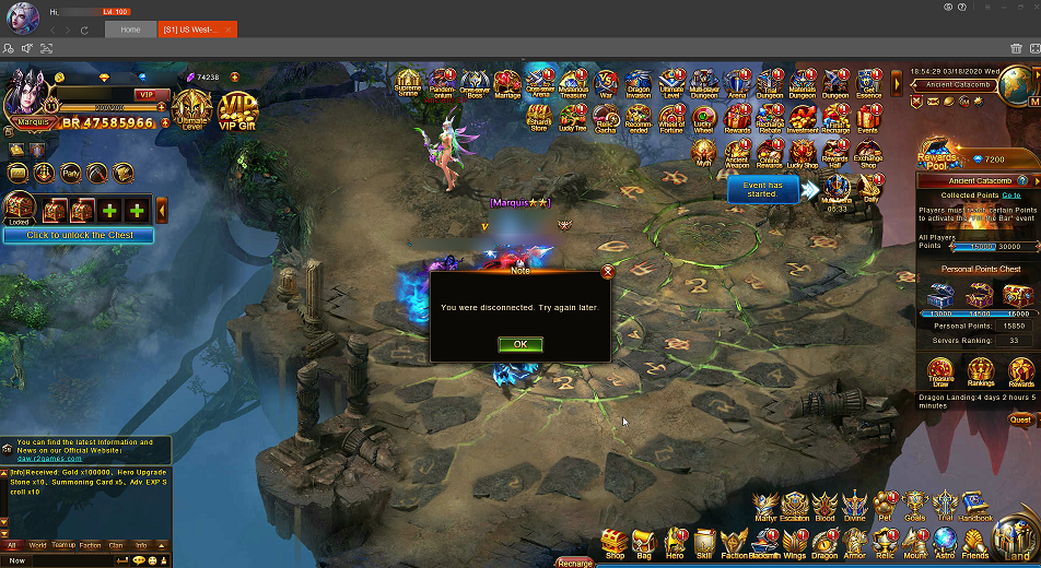 "You were disconnected, try again later". I try so many time going back in there like 4 or 5 times, still couldn't go back in.