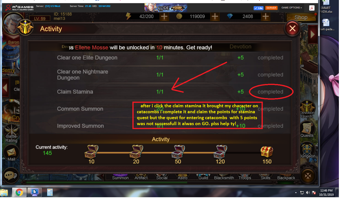 Thank you for the screenshot. Can you show me the quest for entering catacombs not being completed?Originally posted by rommelaydalla13 View Postyah it's same on me after clicking claim stamina my char was brought in catacombs the quest was complete but the quest for entering catacombs was not successfully it always on GoIf you have a problem, need assistance and we can't help? Submit a ticket with R2 here