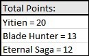 Each entry will be given points based on the place in the poll. If your game's entries are in First, Fifth, and Eighth places, your game will have earned 16 points. If another game's entries are in Second, Third, and Fourth places, it will have earned 21 points, and would be declared the winner, earning the entire game the Game Rewards. Pay attention to how your game is doing in the polls- the key is to keep all 3 entries representing your game at the top in order to win.