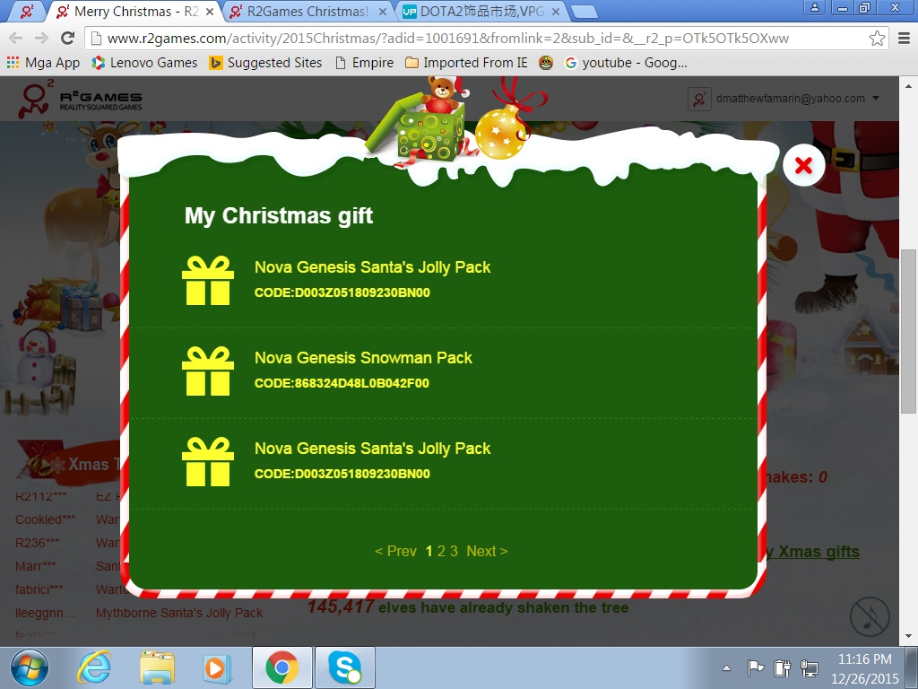 Last edited by dmatthewfamarin; 12-26-2015, 08:16 PM. Reason: Removed screenshot so others can't use your code in case you haven't used some yet.