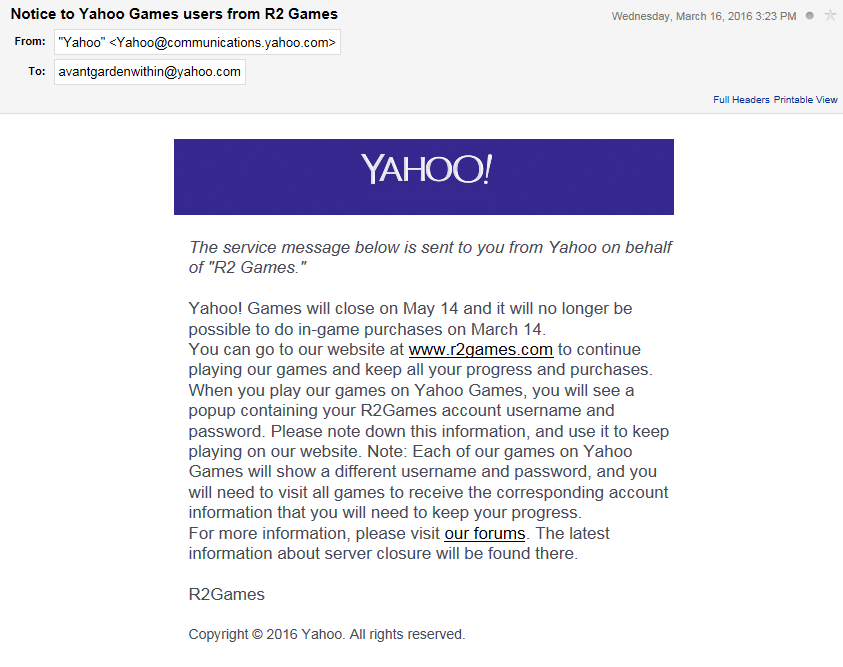 - Yahoo! Games will close on May 14 and game recharging will close on March 14.