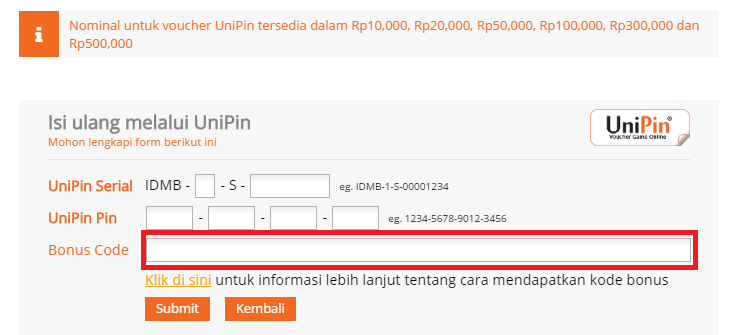 2. Input your code after you got in media social UniPin in “Bonus Code†coloum.