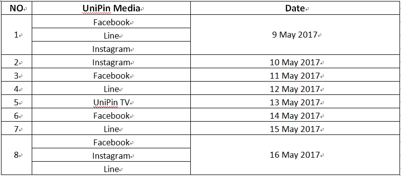 1. You must follow Instagram UniPin : @unipinindonesia2. Subscribe : UniPin TV (https://www.youtube.com/channel/UC5PBJX2egvPFojf_ihUDu7Q)3. Follow Line UniPin : @unipin4. Like fanpage UniPin : https://www.facebook.com/VoucherUniPin/[CENTER]