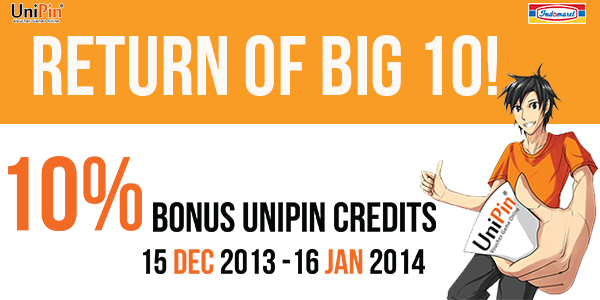 We proudly present to you "Return of UniPin Big 10", a 30 days promotion of 10% Bonus UniPin Credits. This bonus promo is eligible to all Sahabat UniPin who top up 100.000 UC and above to UniPin Wallet using UniPin vouchers, which is available at all Indomaret outlets from 15 December 2013 - 16 January 2014.
